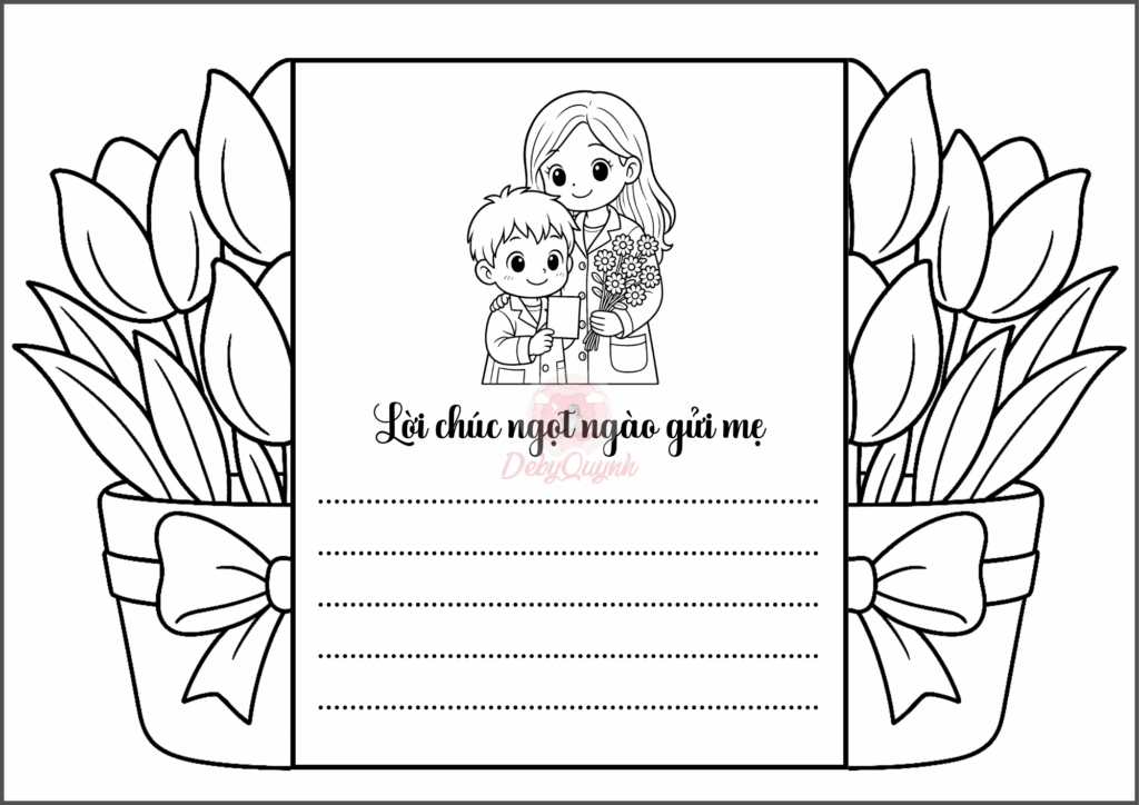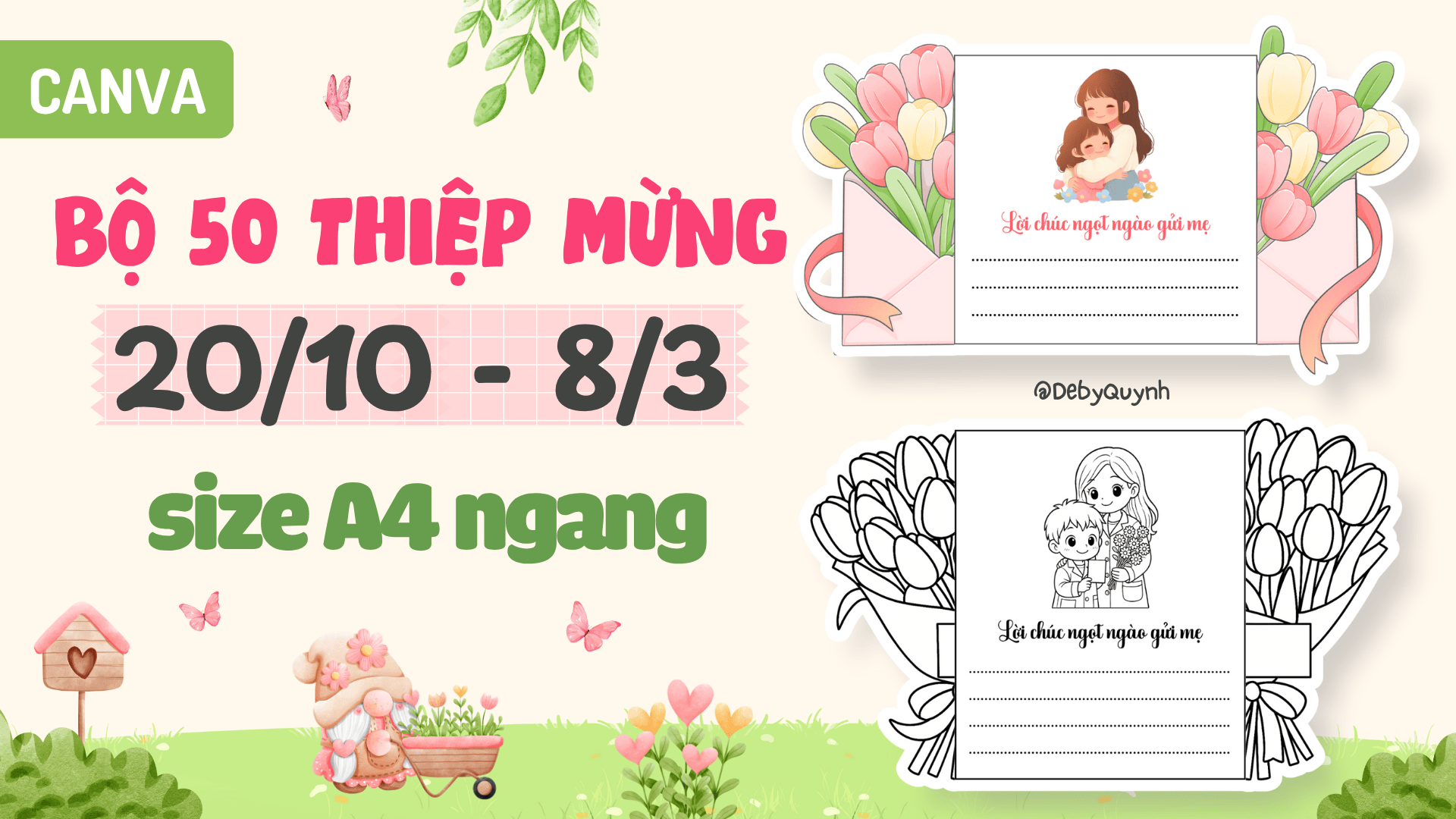 Bộ file gồm 50 mẫu thiệp chúc mừng 20/10, 8/3 tô màu & có màu được thiết kế trên Canva – dễ dàng in ra giấy A4, phù hợp với giáo viên cho học sinh tham gia hoạt động mừng ngày 20/10, 8/3 hoặc ngày của mẹ