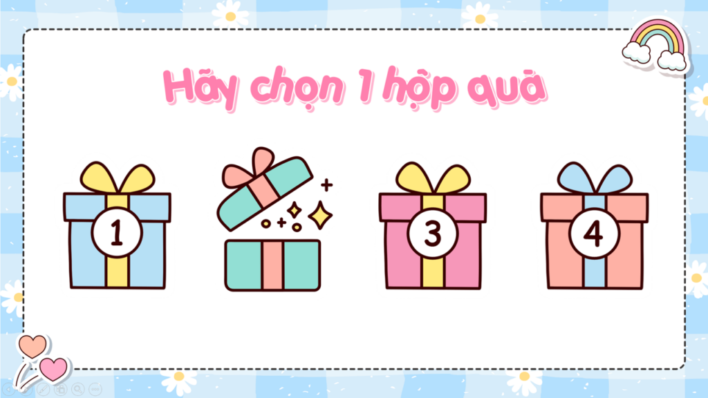 Một trò chơi tương tác giúp lớp học trở nên sôi động với những “món quà ẩn chứa thử thách”! Học sinh sẽ chọn 1 trong các hộp quà bí mật – bên trong có thể là câu hỏi, nhiệm vụ, phần thưởng hoặc lời chúc bất ngờ (tùy nội dung giáo viên chỉnh sửa – bản gốc là các câu hỏi trắc nghiệm nhé)