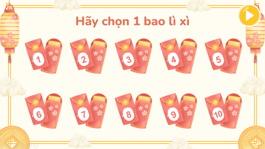 - Trong game gồm 10 bao lì xì – mỗi bao tương ứng với 1 câu hỏi/nhiệm vụ/nội dung (tùy giáo viên chỉnh sửa theo mục tiêu bài học)